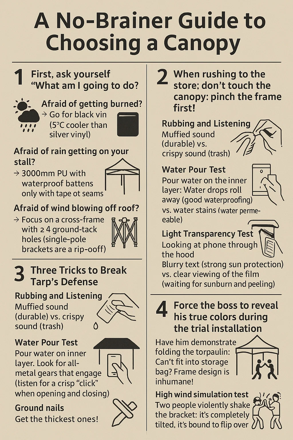 Afraid of rain getting on your stall? → Look for 3000mm PU with waterproof battens (only with tape at the seams).