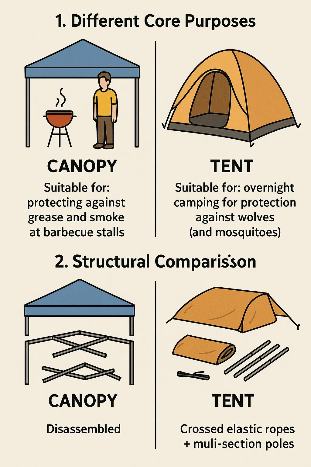 Canopies and tents are completely different things—one's like a roadside stall canopy, the other's like a portable bedroom!