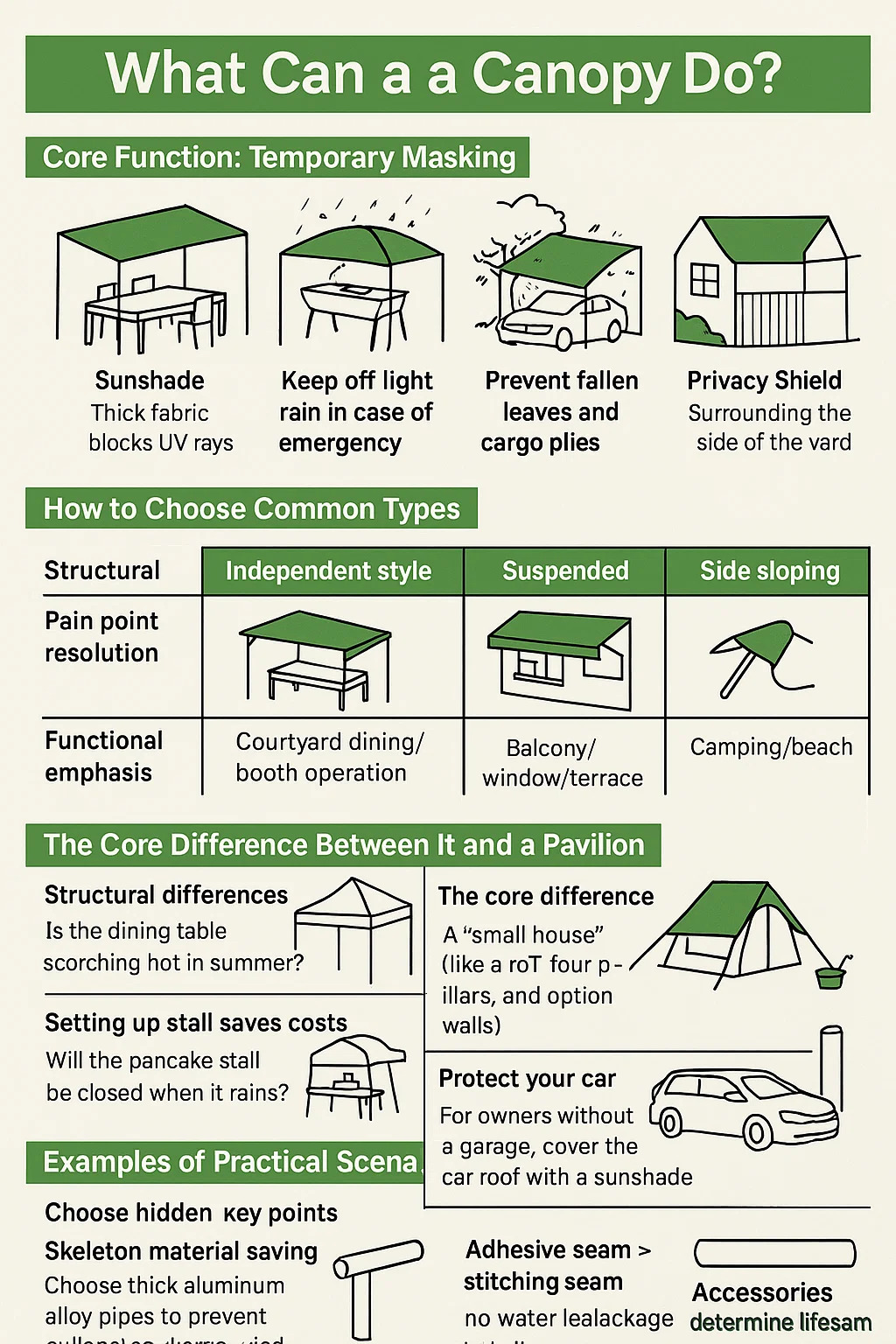 Canopies are "movable outdoor sunshades and rain barriers" - unlike fixed pavilions that require a foundation, they are supported by shelves or hung directly on objects, and can be collected after use. The essence is to quickly create a shadow for you, focusing on these characteristics: