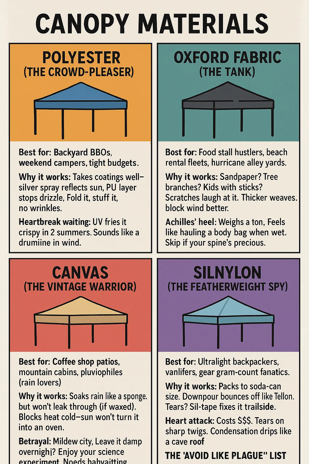 | All-day downpour | Silnylon OR waxed canvas | Polyester leaks at seams eventually |