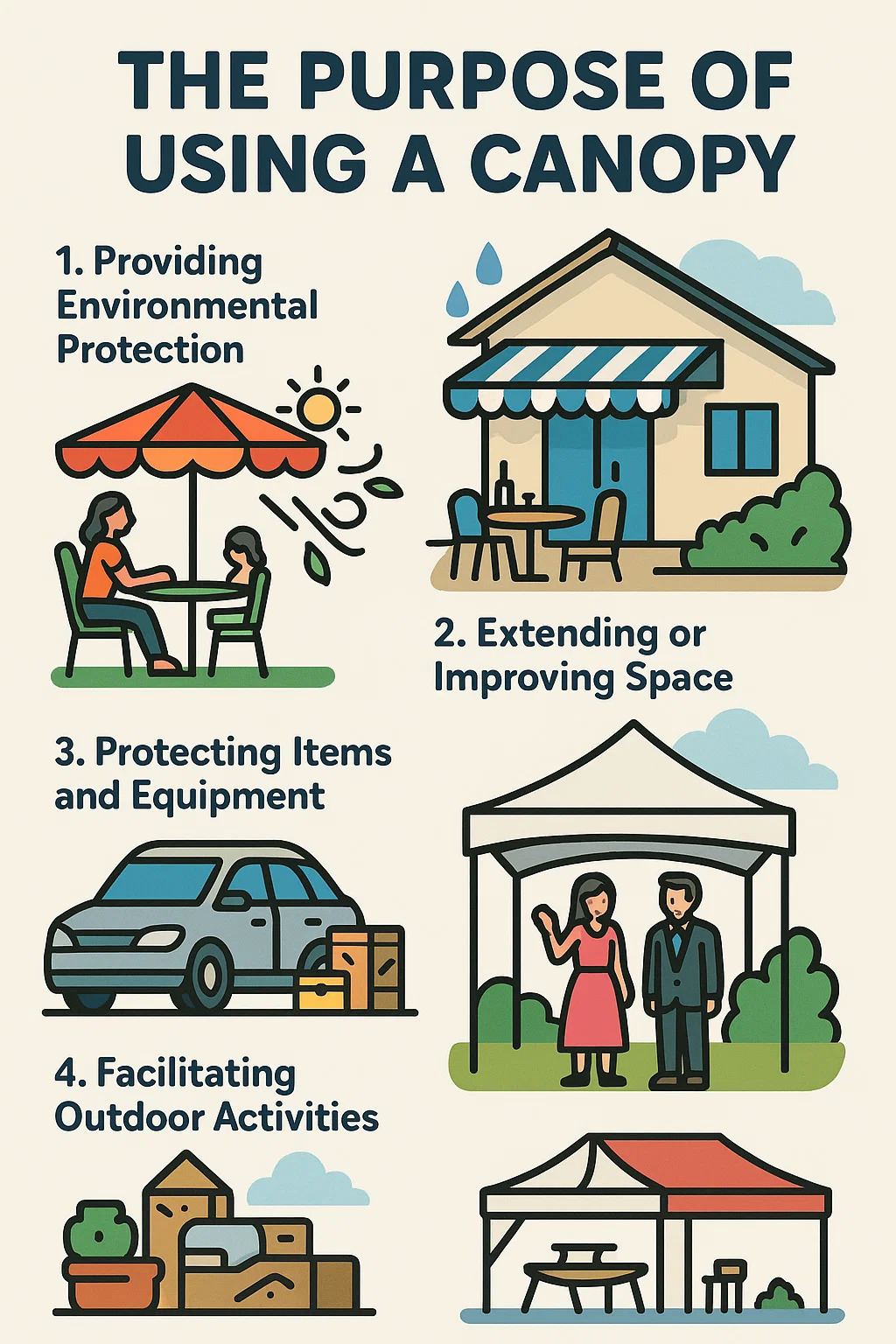 A canopy is essentially a covering structure used in many different situations, primarily to provide protection and convenience. Here are some of its main uses: